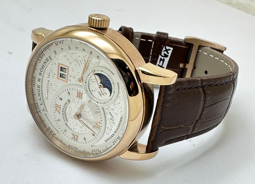 Experience the epitome of luxury with the A. Lange & Söhne Grand Lange 1 Moon Phase in exquisite rose gold. This Swiss automatic watch showcases a stunning white dial, elegantly displaying the iconic asymmetrical design that Lange is renowned for. The moon phase complication adds a touch of celestial charm, while the meticulous craftsmanship ensures precision and durability. Perfect for the discerning connoisseur, this timepiece not only tells time but also tells a story of sophistication and timeless elegance. Elevate your collection with this masterpiece that seamlessly blends artistry and functionality.