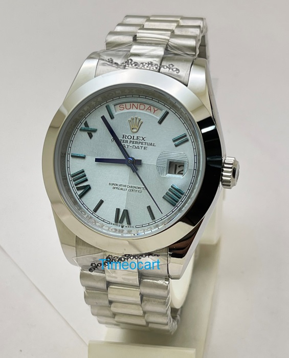 Elevate your timepiece collection with the Rolex Day-Date Roman Mark Ice-Blue First Copy Replica Watch Kanpur, a stunning embodiment of luxury and sophistication. This exquisite watch features a striking ice-blue dial adorned with elegant Roman numerals, offering a unique twist on the classic Day-Date design. Crafted from premium materials, it boasts a robust 18k gold case and a meticulously engineered automatic movement, ensuring both durability and precision. The iconic President bracelet adds a touch of refinement, making it the perfect accessory for any occasion. Experience the perfect blend of style and functionality with this timeless masterpiece.