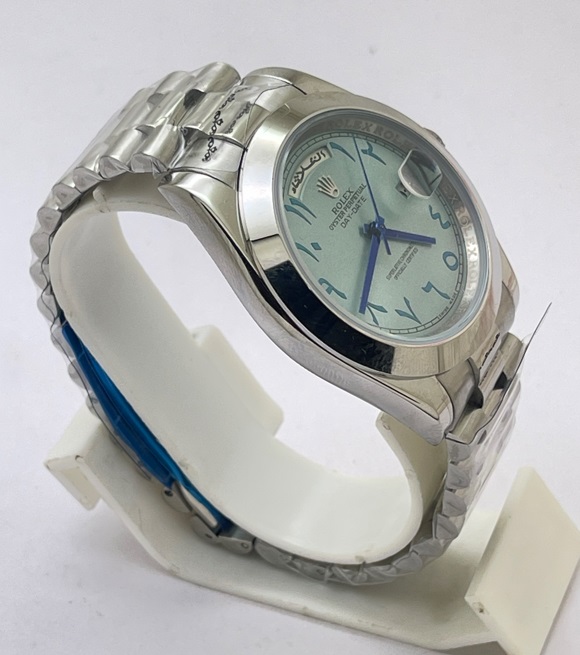 Experience the epitome of luxury with the Rolex Day-Date Arabic Dial Ice Blue Automatic Copy Watch. This exquisite timepiece features a stunning ice blue dial adorned with Arabic numerals, offering a unique and sophisticated aesthetic. Crafted with precision, the automatic movement ensures reliability and accuracy. At the same time, the iconic Day-Date function displays both the date and day of the week, making it a perfect blend of style and functionality. Elevate your collection with this timeless watch that embodies elegance and prestige, ideal for any occasion.
