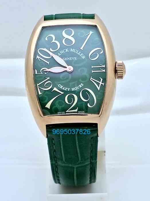 Experience the extraordinary with the Franck Muller Crazy Hours first copy Watch, a stunning blend of innovative design and luxurious craftsmanship. This timepiece features a unique dial that showcases an unconventional hour display, allowing you to tell time in a playful yet sophisticated manner. The vibrant green accents add a fresh pop of color, making it a perfect accessory for any outfit. With its high-quality materials and meticulous attention to detail, this watch not only elevates your style but also ensures durability and precision. Embrace the art of timekeeping with a watch that truly stands out from the crowd.