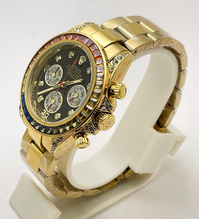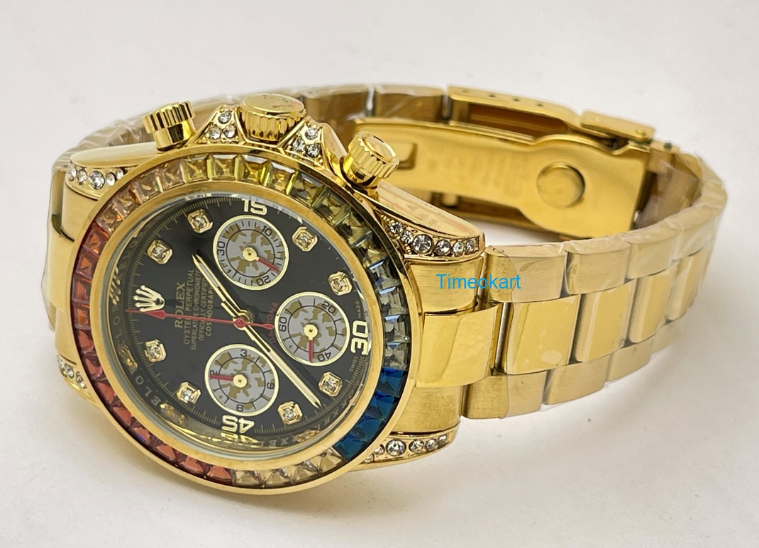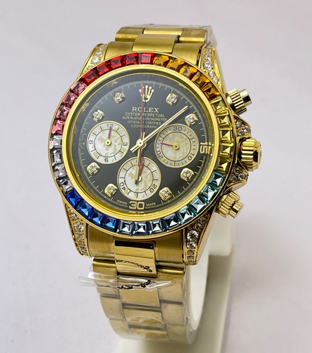 Elevate your timepiece collection with the Rolex Cosmograph Daytona Rainbow Jewels Flyback Chronograph First Copy Replica Watch, a stunning blend of luxury and precision. This exquisite watch features a vibrant array of multicolored gemstones that encircle the bezel, creating a dazzling effect that captures attention. The flyback chronograph function allows for seamless timing, while the iconic Oyster case ensures durability and water resistance. With its impeccable craftsmanship and timeless design, this watch is not just an accessory but a statement of sophistication and style, perfect for the discerning individual who appreciates the finer things in life.