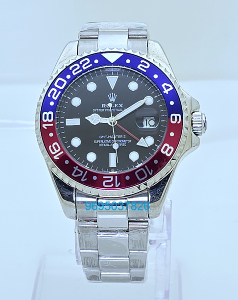 Experience the perfect blend of luxury and functionality with the Rolex GMT Master Pepsi Edition First Copy Watches. Renowned for its iconic red and blue bezel, this timepiece is designed for the modern traveler, featuring a dual time zone function that allows you to effortlessly track time across different regions. Crafted with precision, the watch boasts a robust stainless steel case and a scratch-resistant sapphire crystal, ensuring durability and elegance. Elevate your style and make a statement with this timeless classic that embodies both sophistication and practicality.
