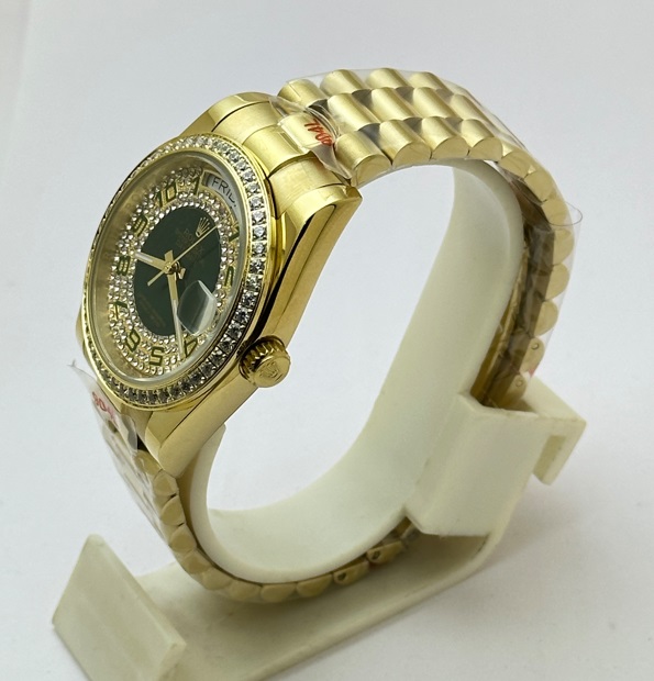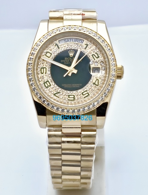 Elevate your elegance with the Rolex Day-Date Green Diamond Paved Gold Watch, a stunning masterpiece that combines luxury and sophistication. Crafted from exquisite gold, this timepiece features a dazzling green diamond-paved dial that captures the light beautifully, making it a true statement piece. The iconic Day-Date function ensures you stay organized while exuding an air of prestige, perfect for both formal occasions and everyday wear. With its impeccable craftsmanship and timeless design, this watch is not just an accessory; it’s an investment in style and status.